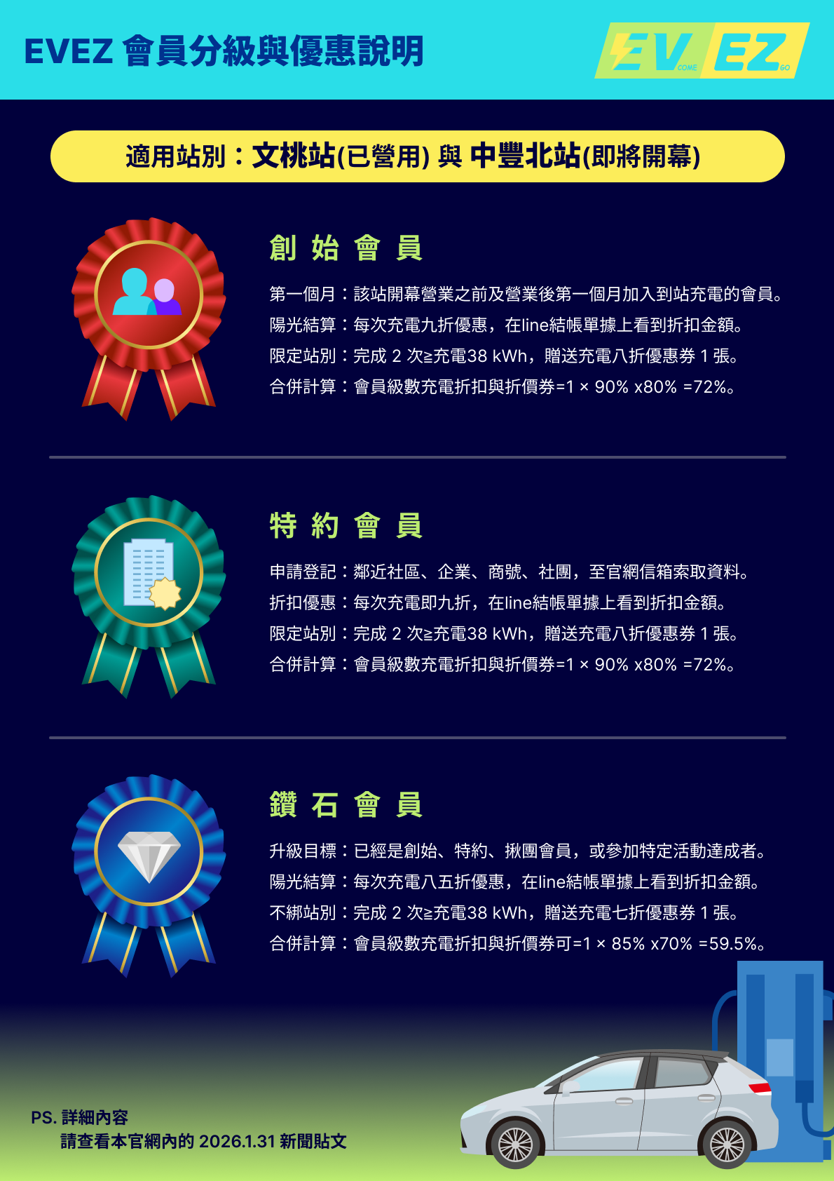 優惠會員:申請及響應活動,分為創始、特約(社區/企業)、白金、鑽石,充電享有優惠及折扣。