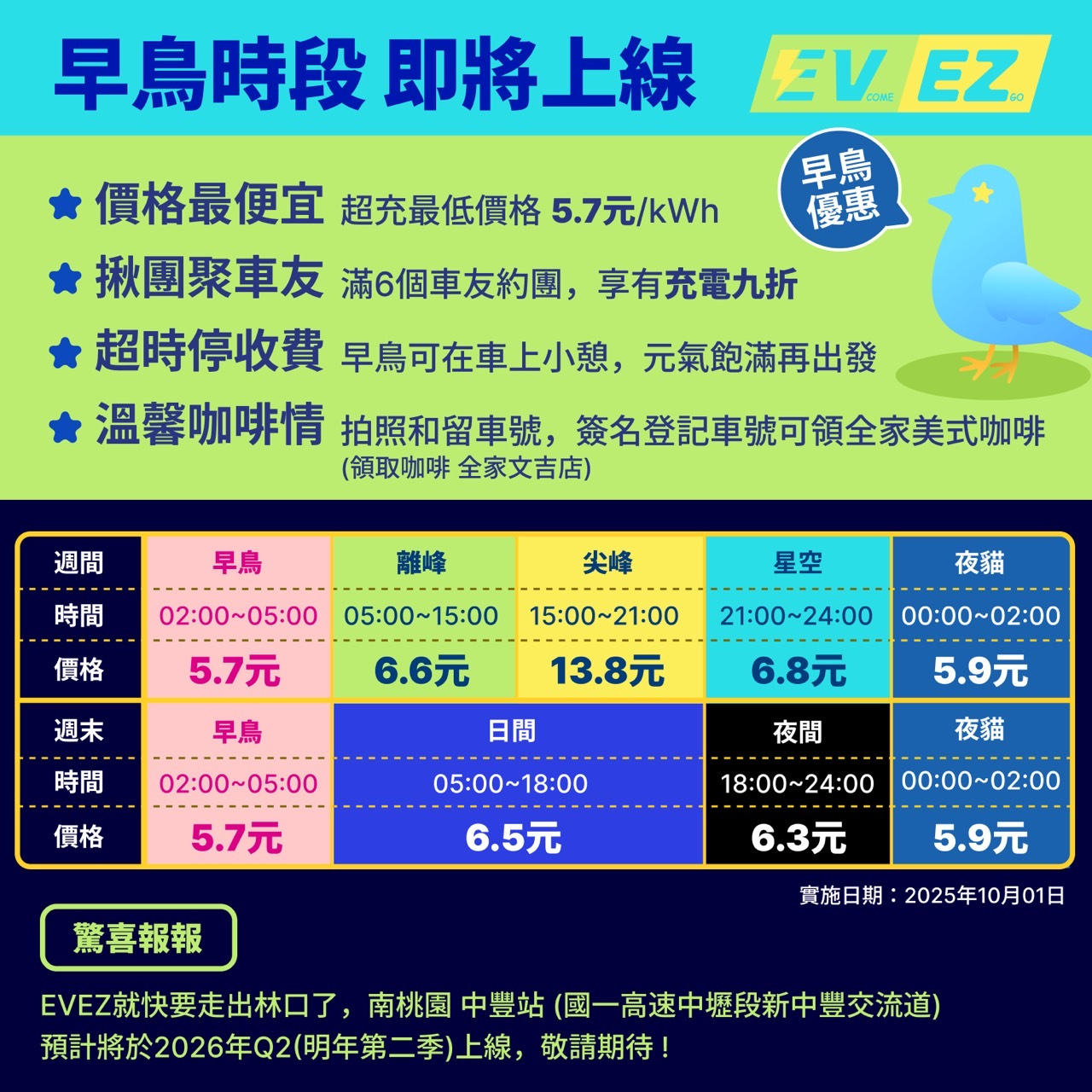 為了體貼開夜車的運匠和夜歸族朋友們,EVEZ 將從 2025.10.01 起新增時段,將在夜貓時段之後的 02:00 AM~05:00 (周一到周日都有),從原本夜貓時段中再分割增加早鳥時段,這時段我們將會這樣經營。
