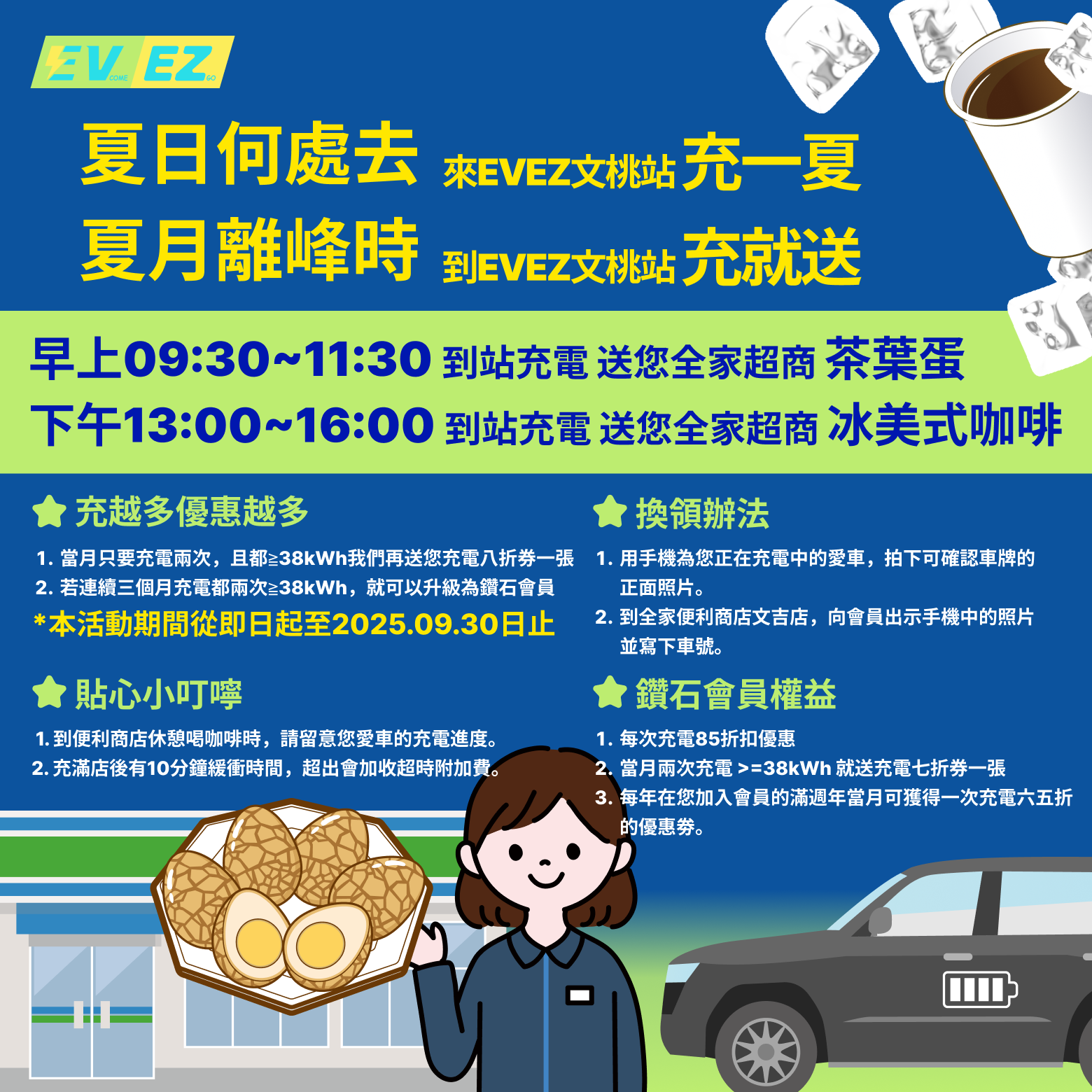 另外﹔我們也為您準備了全家便利商店您充電換小小的貼心禮。當您的愛車在充電時,輕鬆散步的到全家文吉店憑您充店中的愛車照片,兌換茶葉蛋(早上)和冰美式(下午)。