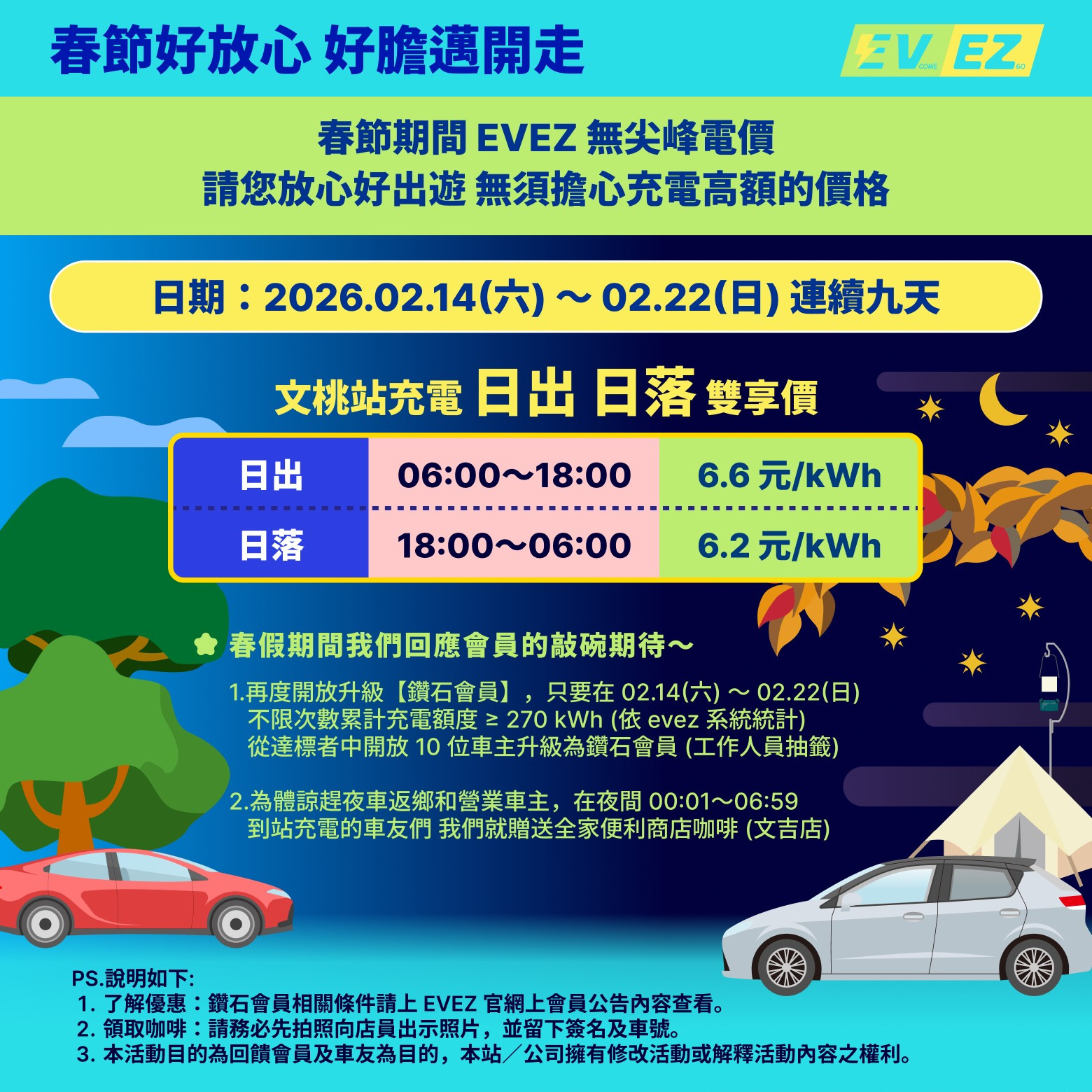 【EVEZ 訊】文桃站於 2.14~2.22 的年假期間,將暫停尖峰費率,連續 9 天全天,日出日落充電費用雙享價,午夜過後到站充電還送暖心咖啡哦。